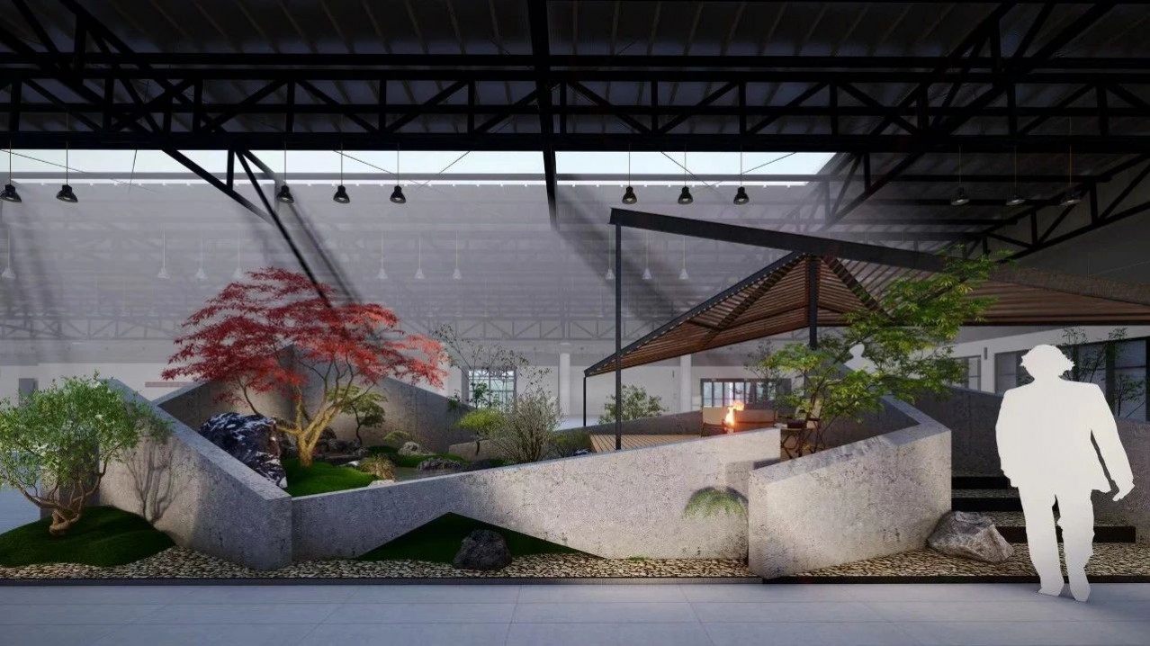 本設計意打造一個反樸還淳的狀態(tài),用最常見的材料打造一個空間、光影、色彩豐富的場景。樹皮代替土壤孕育綠植叢生。砂巖穩(wěn)若巖石給人安全的踩踏感。水泥板和隔扇屏風給到空間家一樣的圍合感。體驗其中,夯土墻的通道跨越時代的轉換,老布料的門簾想起媽媽的味道。