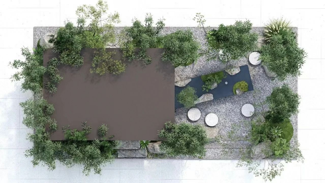 小院用三兩步汀步,一潭清水,搭配起伏的地形,融入自然的一花一草,一石一木,營造山水相依,小橋流水,草木為伴的靜謐空間。