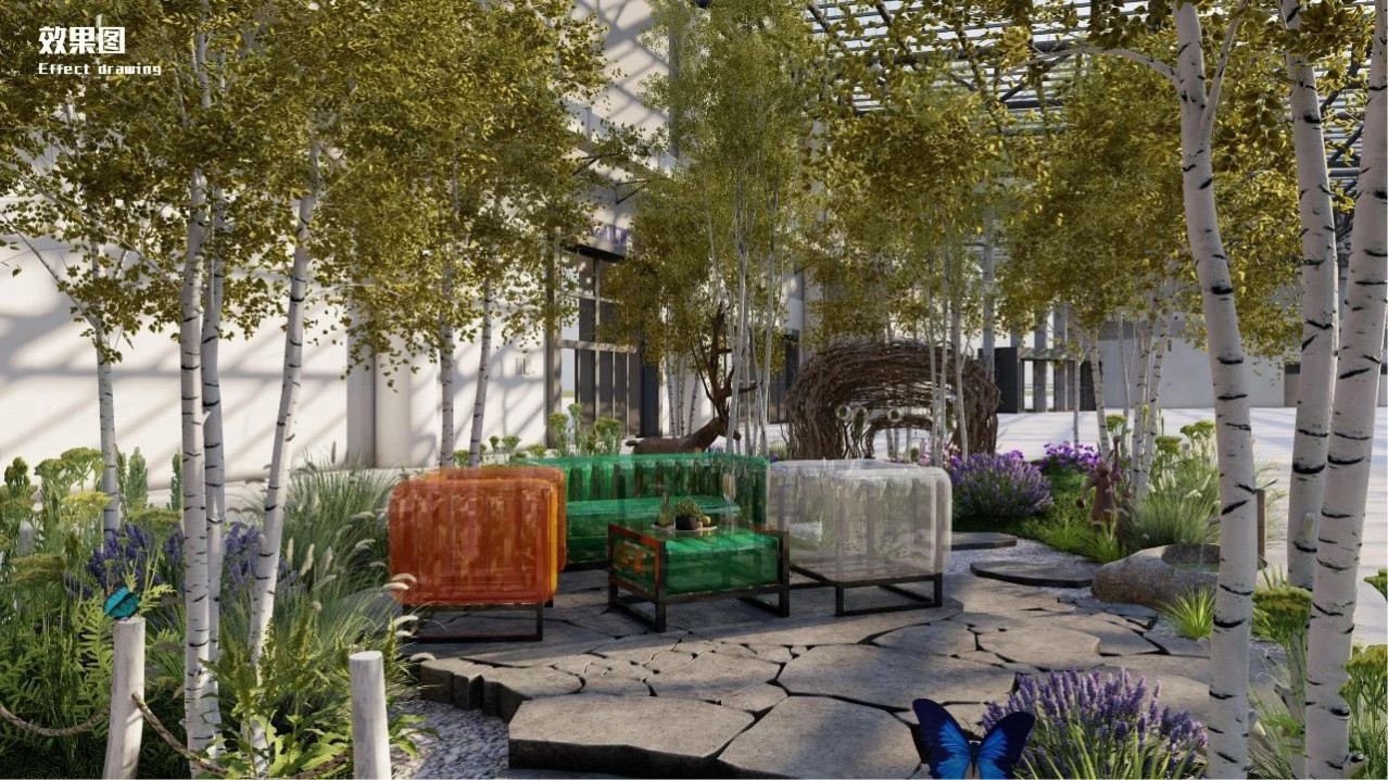 選用帶著遠方鮮意的白樺林進行自然山林空間造景,讓人們仿若置身于白樺林浪漫的秋色中。由設計師親自手作的安全島將成為白樺林中的冥想地,拙樸野趣自然,在音樂和梵香中,讓人靜下來自由冥想放松……精致而富有創(chuàng)意的生態(tài)缸點綴林間,蘊含生機活力,傳遞植物“家”的力量……